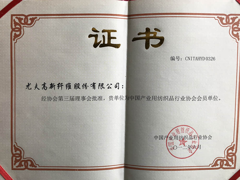 2012產業用紡織品行業協會會員單位證書